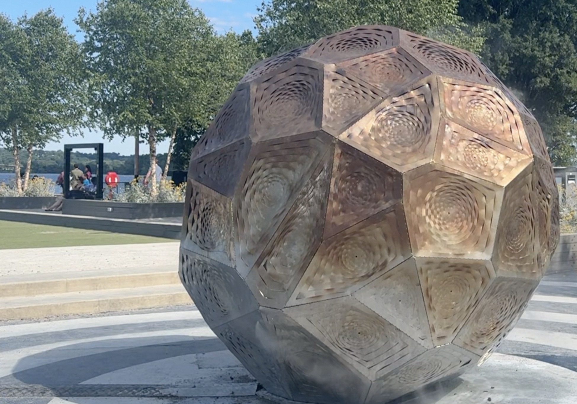 Since we were all very full from dinner and ice cream, we decided to walk around the Waterfront area. Right across from Mai Thai and Pop’s Ice Cream is an art installation, which changes every so often. The current exhibition is called ‘Interstellar Influencer‘, on display until Nov. 2024. It resembles a geometric metallic asteroid, with mist coming off it!
